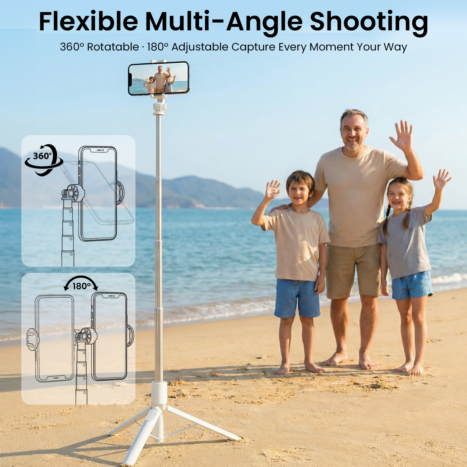 【Multi-Angle Shooting Flexibility】 Unleash creativity with a 360° rotating & 180° tilt phone holder. Effortlessly switch between landscape, portrait, overhead or low-angle shots for TikTok, YouTube, travel footage or family moments. Every angle is yours to command.
