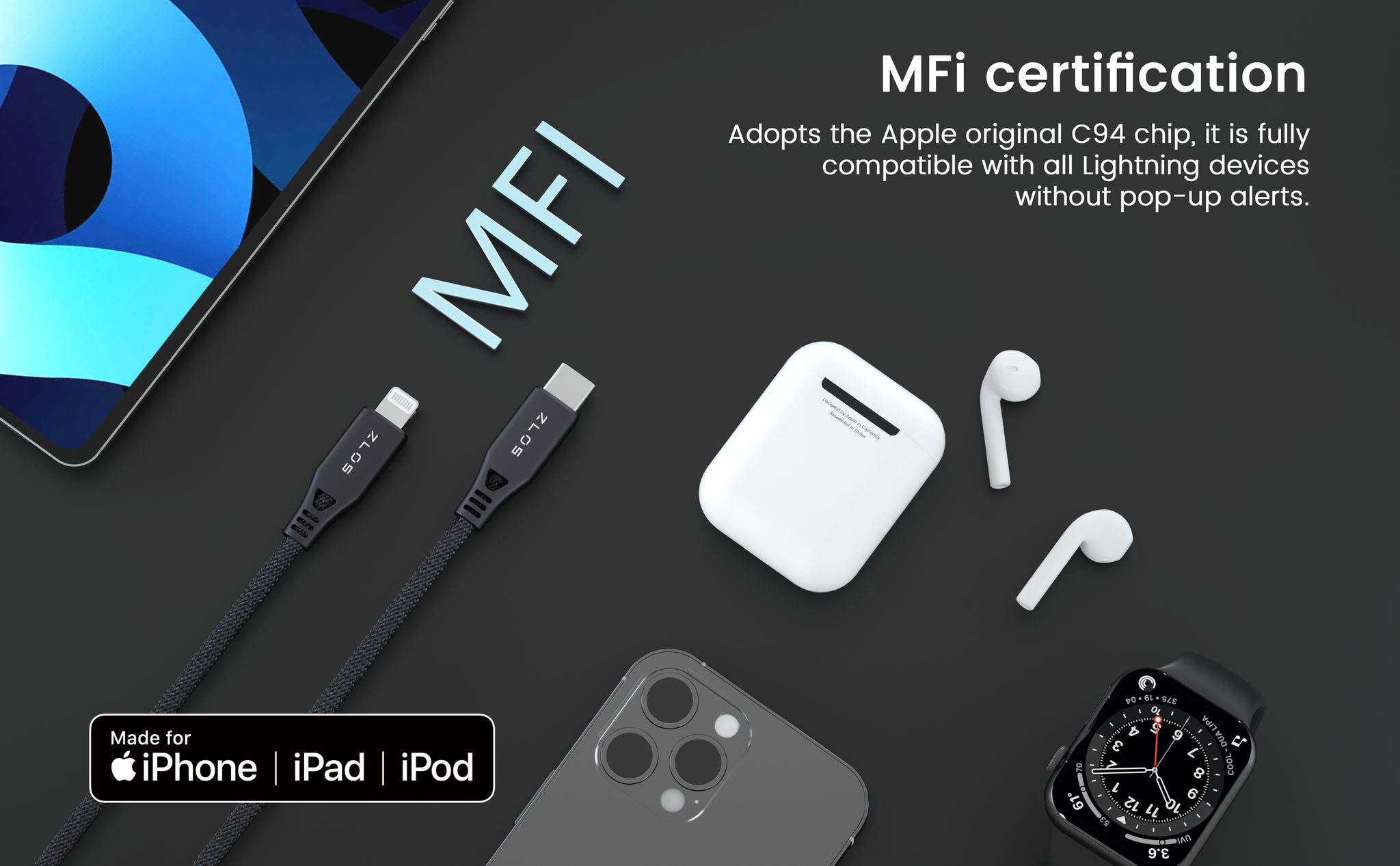 Der eingebaute Apple C94 MFi-Authentifizierungschip lässt Ihr Gerät wissen, dass dieses Kabel zertifiziert und sicher zu verwenden ist, verhindert störende Popups und hilft Ihnen, beruhigt zu bleiben.