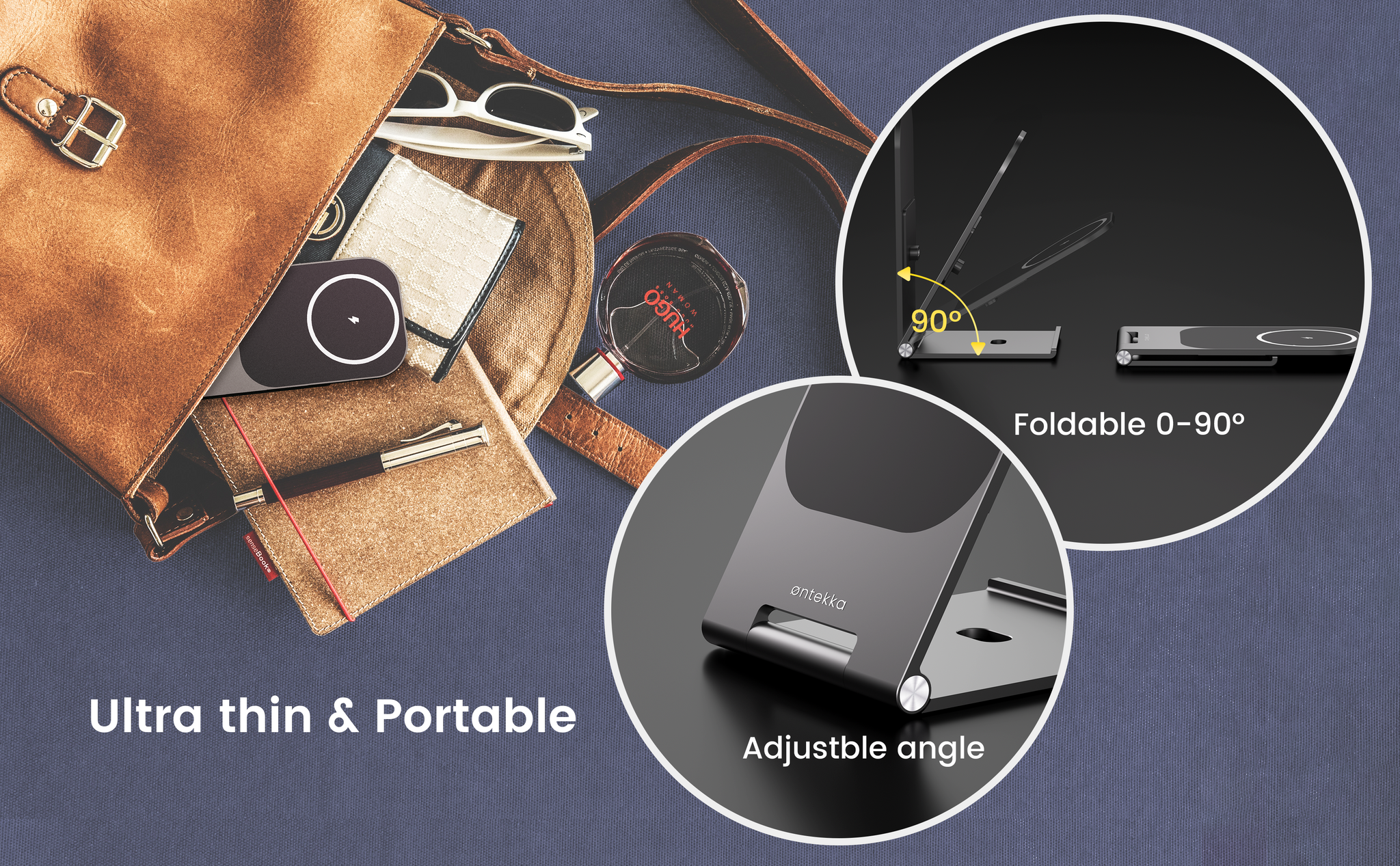 A carefully designed folding mechanism allows you to set your phone at the perfect angle, as well as fold down flat to pack anywhere.